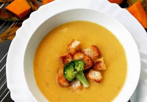 Върнете тенджерата обратно на котлона и оставете да кипне, щом клокне махнете. Поднесете супата с крутоните.