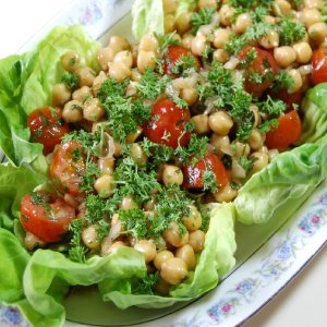 След като изцедите нахута го поставете в дълбок съд. Нарежете домата на кубчета и добавете заедно с руколата ( или зелената салата по ваш избор). Нарежете магданоза и пресният лук на ситно и добавете към останалите продукти. Добавете маслините. За дресинг използвайте зехтин и сока от 1 лимон.